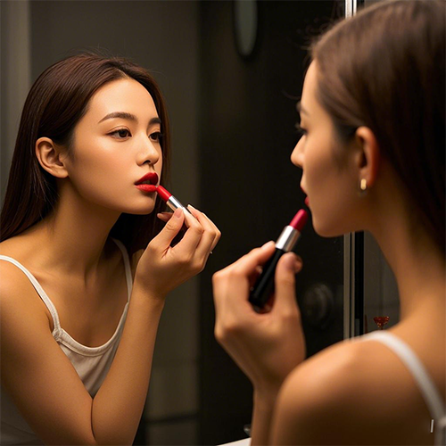 涂口红我们可以适当地运用棉签来晕染,过渡一下我们的唇线,让唇线的边界模糊一点,这种化妆效果会在无形当中让我们的唇线内收一点,让嘴唇看起来更加的饱满立体。