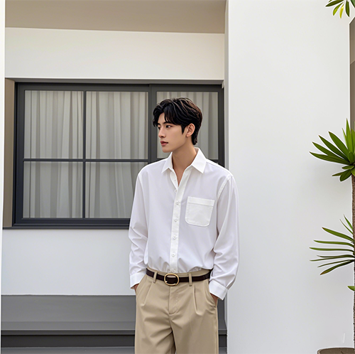 白色的翻领衬衣搭配了杏色的休闲裤,腰部用了一根同时各的腰带做搭配,整体的造型就是很文艺气质的造型,尤其是适合走这一类风格的男生。简约的颜色以及款式的搭配,都完全的彰显了男生本来的时尚感。