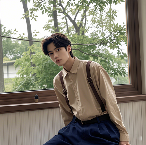 沈阳化妆学校的老师说过这种风格的背带裤就是在营造一种复古的情怀和气质,上身搭配的是杏色的翻领衬衣,下身搭配的是这种藏蓝色的复古气质背带裤,特别温文儒雅的一套搭配,会让男生的气质变得非常的沉静和文艺。
