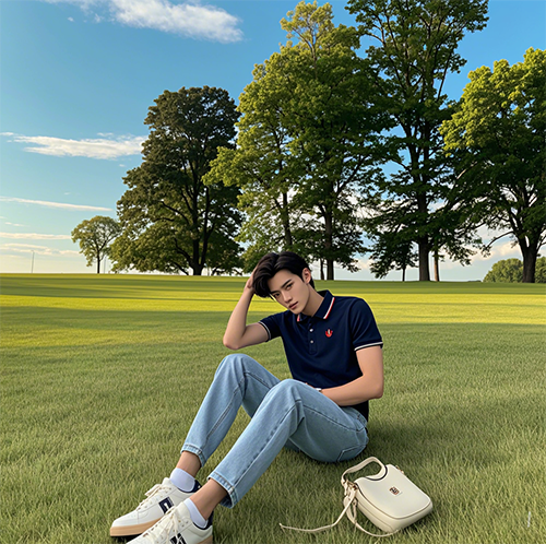 Polo衫其实是很显气质的一款单品,不管是男生还是女生,穿着都会尤其的帅气,藏蓝色又是很典型的一个颜色。下身搭配的是浅色的直筒牛仔裤,非常的阳光又充满朝气。