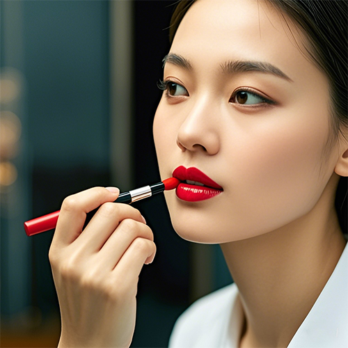 口红在唇锋下手时不要太重,因为唇锋形状影响整个唇彩的效果极大,太平、太尖都不好看。