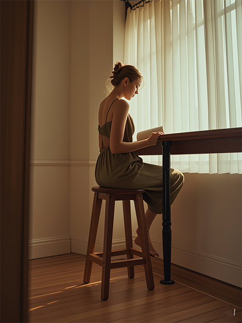 人物动作:侧坐高凳,背部挺直,低头看书,微微露出侧脸轮廓。