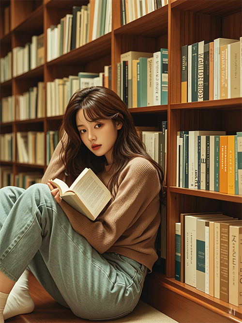 人物动作:靠着书架坐下,撑起双腿,低头看书,露出镜头一方的侧脸或让头发自然垂落。
