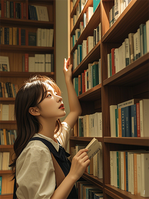 人物动作:面向书架,伸手抽出高排的书籍,微仰头,露出侧脸轮廓。