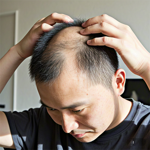 四级脱发:前额明显秃发,整体头顶部位稀疏,但头发没有完全脱落,还有一些细软的头发存在。