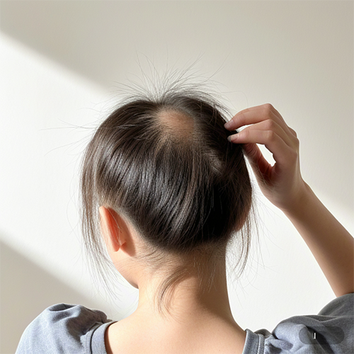 五级脱发:前额及头旋部位头发脱落,中间形成断带,脱发面积较大。