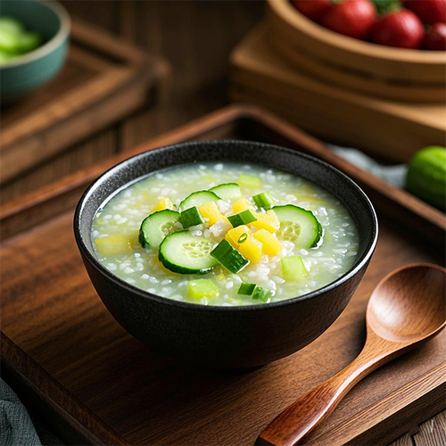 取大米100克,鲜嫩黄瓜300克,精盐2克,生姜10克。将黄瓜洗净,去皮去心切成薄片。大米淘洗干净,生姜洗净拍碎。锅内加水约1000毫升,置火上,下大米、生姜,武火烧开后,改用文火慢慢煮至米烂时下入黄瓜片,再煮至汤稠,入精盐调味即可。