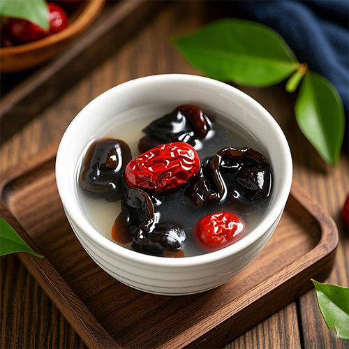 取黑木耳30克,红枣20枚。将黑木耳洗净,红枣去核,加水适量,煮半个小时左右。