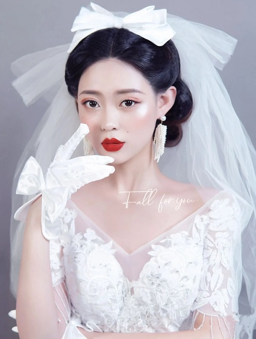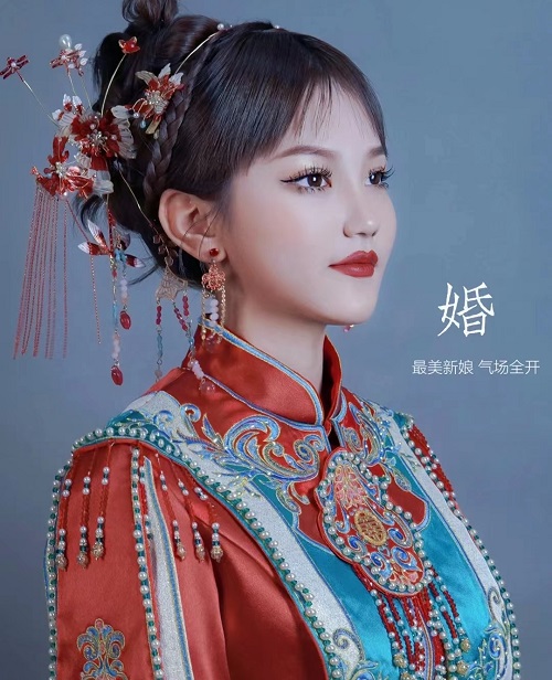 ▶沈阳化妆学校提示:大多数新娘会在敬酒环节选择中式礼服,此刻的妆容也应更趋向于中式新娘的端庄温婉。适量的亮质粉底与淡淡粉橘调暖系妆容会更加适合,鲜亮的大红唇是打造中式新娘妆容的重点,发型上以古典盘发和发髻为主,更加古典可人。