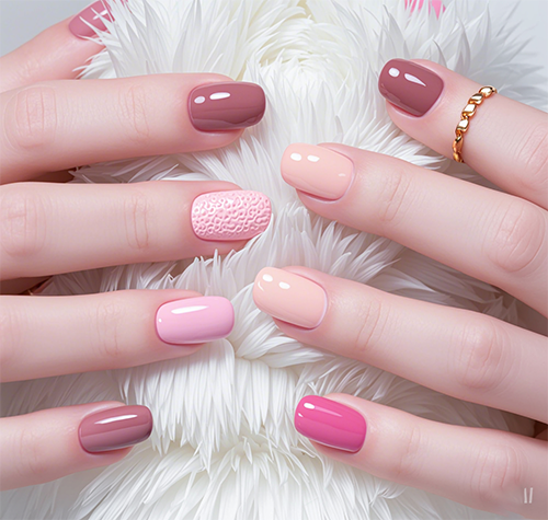 想要做出颜色通透的款式,可以试试这个方法。今年流行的贝壳片一般用透乳白或透浅粉来打底,最初我常常用底胶或者擦洗封层加色胶调出清透的颜色。