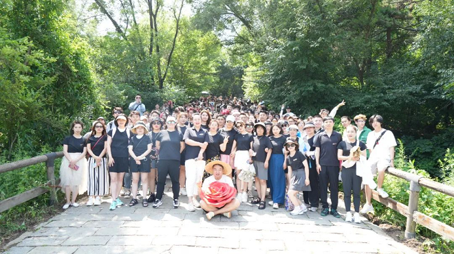 到了山脚下,怎么能不来张大合照呢,全校师生簇拥在一起,把整个下山口都站满了,从大家的笑容可以看得出来是有多开心了。