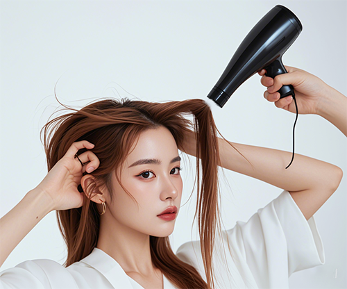 另外,使用吹风机时,最好风口朝下,与头皮保持一些距离,大约15cm左右,避免直吹头皮。