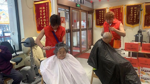 伴着和煦的春光,沈阳统丽学校的学生们一边理发,一边和老人们拉着家常,人群里时时传来他们的阵阵欢笑声。