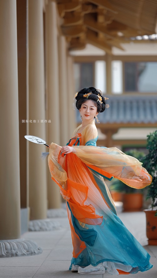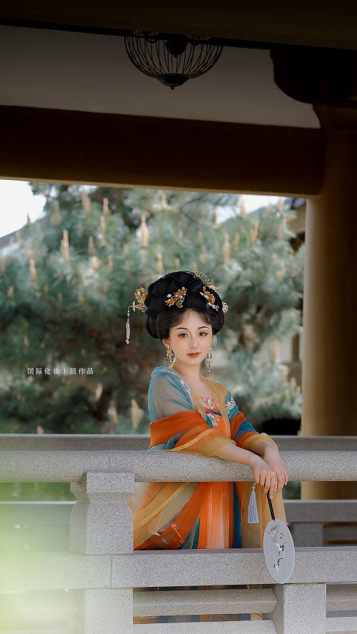 大唐女子的妆容,注重面部轮廓的修饰与色彩的搭配。她们以黛眉为美,将眉毛修饰得纤细而修长,如同柳叶般婉约。眼妆则是妆容的灵魂,女子们以眼线勾勒出深邃的眼眸,再配以眼影的晕染,使得双眼更显深邃与妩媚。腮红则是用来提升气色,她们巧妙地运用腮红,打造出自然的红润感,使得面部更加立体生动。