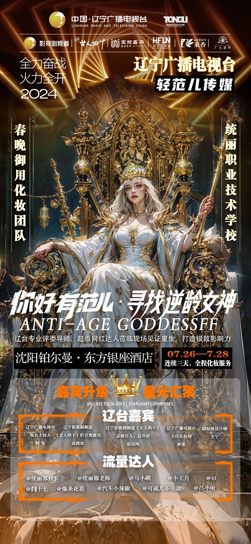 本次《寻找逆龄女神》第四季星推官评选活动还邀请了许多嘉宾——辽宁广播电视台知名主持人阿宝、辽宁影视剧频道《女人四十》栏目观察员高晓欢、辽宁影视剧频道《女人四十》总制片人、总导演赵冠闻、辽宁广播电视台主任化妆师林霏、国际级设计师王宁等等以及众多流量达人。在这个舞台上,你就是主角,由专业评委导师、超级网红达人见证星生,打造极致影响力。7月26日——7月28日在沈阳铂尔曼·东方银座酒店,让我们一同期待这场由统丽学校春晚御用化妆团队全程跟进的你好有范儿《寻找逆龄女神》第四季,见证每一位参赛者如何在时光的洗礼下,绽放出更加耀眼的光芒。这不仅是一场关于美丽的竞赛,更是一次心灵的洗礼与成长的蜕变。逆龄之旅,即将启程,你,准备好了吗?
