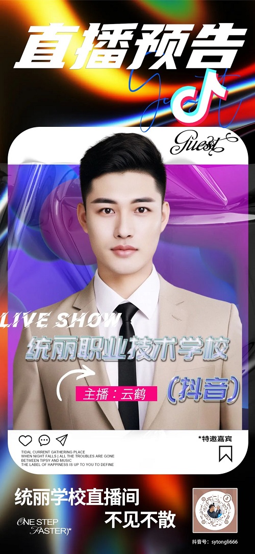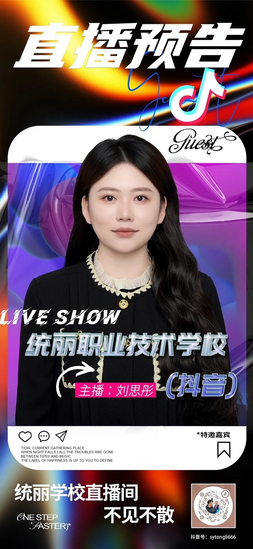 直播平台与账号:抖音统丽职业技术学校直播时间:13-16点直播平台与账号:抖音统丽职业技术学校