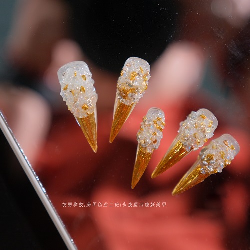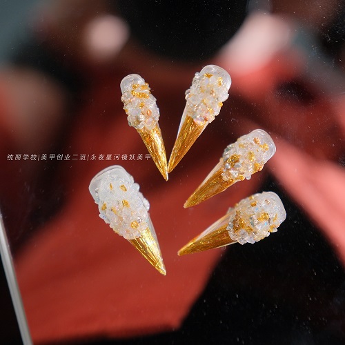 金色的魔镜粉和碎钻的完美结合,美甲师的巧手刻画出纹理,妖艳魅惑展现的淋漓尽致,每一片碎钻在灯光下轻轻闪烁,仿佛夜空中最璀璨的星辰,悄然降落在陈都灵的指尖。