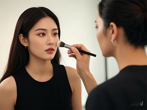 法令纹:选择浅米色哑光遮瑕,用扁平刷精准填充凹陷处,并向苹果肌方向晕染,制造“提拉感”;