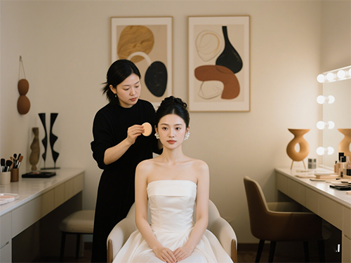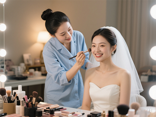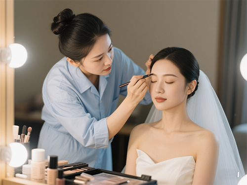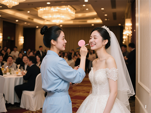 婚礼当天的补妆也很讲究。要注意先用吸油纸轻按出油部位,然后喷保湿喷雾,再用气垫粉底局部补妆,最后轻扫蜜粉和补口红。这样补出来的妆容就像刚化好一样精致。