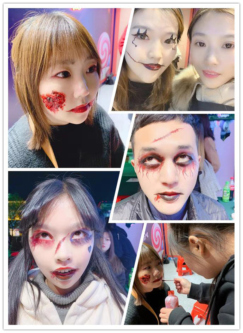 此次方特万圣节主题活动期间,受活动主办方的特别邀请以及在郭校长的安排下,擅长特效化妆和造型的国际化妆班学员,在李春杰老师的带领下连续奋战多日,为数不清的各路鬼怪提供了助妆服务,为此次万圣节马拉松庆典的顺利举办提供了重要的技术支持和保证,给无数游客带来激情、留下难忘印象。