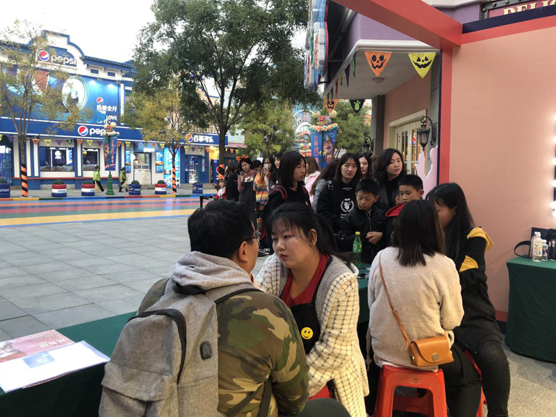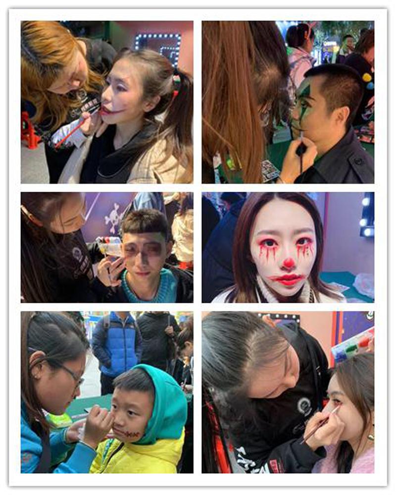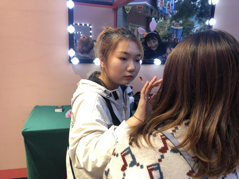 此次活动闭幕式,自然少不了国际化妆班的身影!李春杰老师再一次带领精英学员远赴方特乐园,为闭幕式提供助妆服务。天气渐寒,但游客依旧接踵,热切期待着属于自己的“鬼面”。