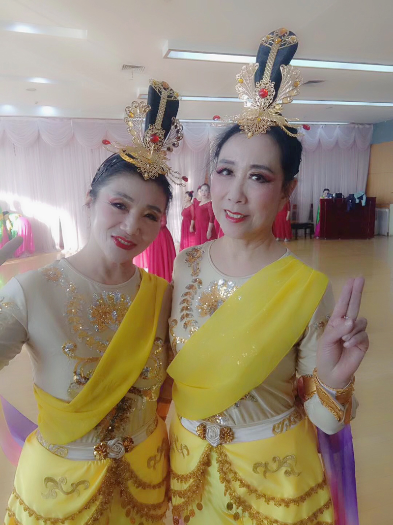 助妆过程中,学员们还不时地与老人们谈天说地, 演出后台欢声不断,微笑始终挂在老人们的嘴边。当然,统丽学员的劳动成果也征服了所有人,所有大爷大妈们竖起大拇指!