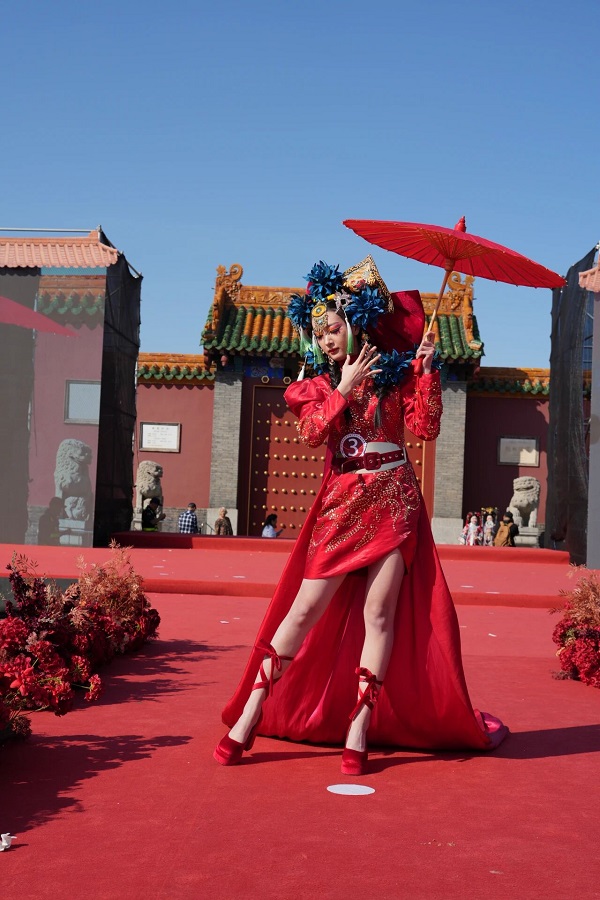 走秀伊始,融合古典绛色底蕴与现代彩妆美学的红礼服造型率先登场,瞬间点燃全场气氛。礼服以炽烈正红为主色调,流动的面料如同跳跃的火焰,将舞台渲染得热烈而奔放。这件礼服不仅是服饰的呈现,更是化妆师创意的绝佳载体 —— 色彩定格热烈情绪,线条勾勒优雅轮廓,每一处细节都尽显匠心。