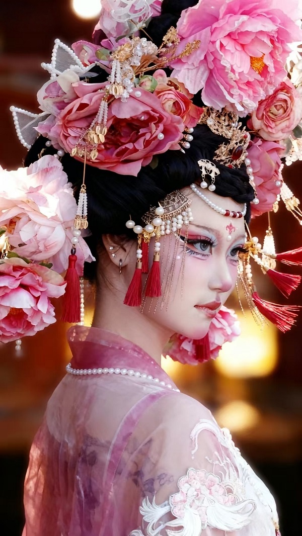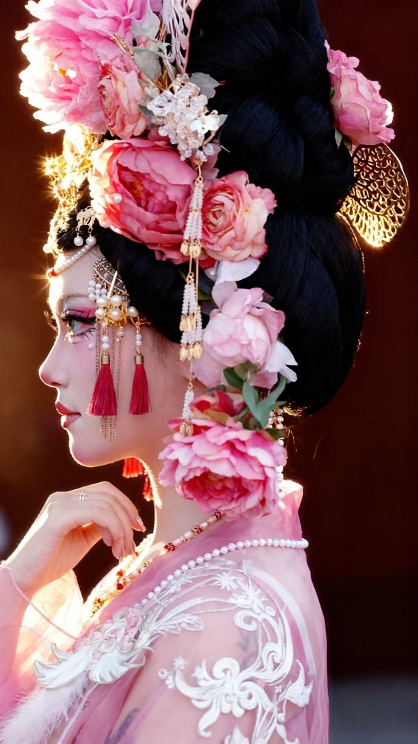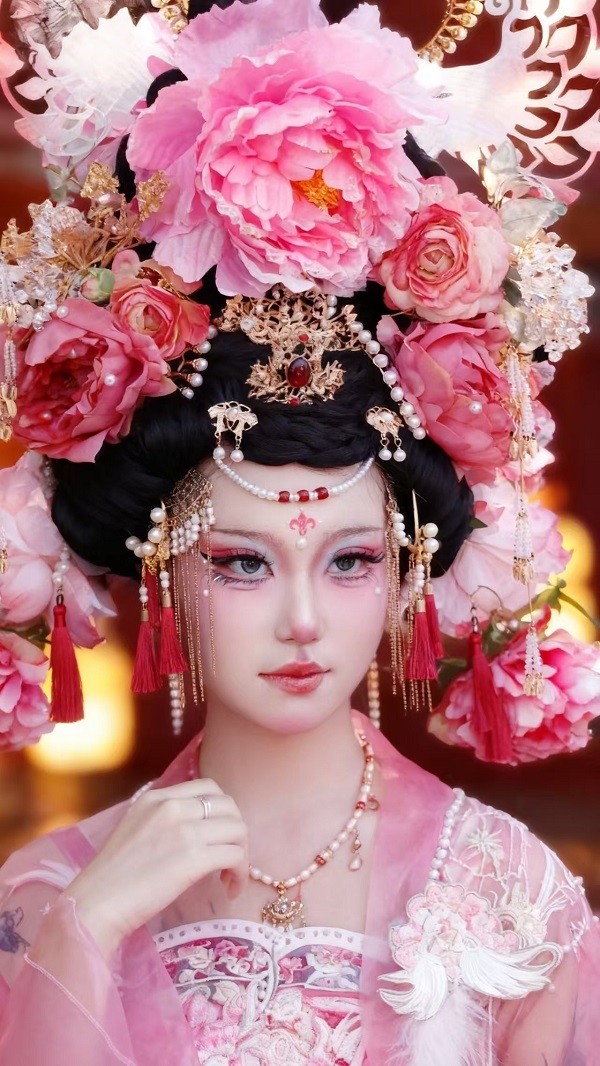 整体搭配更是 “锦上添花”,额头中央的红色花钿的点缀,既强化了古风辨识度,又与唇色、眼尾深粉形成色彩呼应。头上的大朵粉色牡丹、金色饰件与珍珠流苏步摇,搭配粉色薄纱服饰,让妆容、头饰与服装色调统一,构成和谐的整体,将古典美人的艳丽与精致展现得淋漓尽致。
