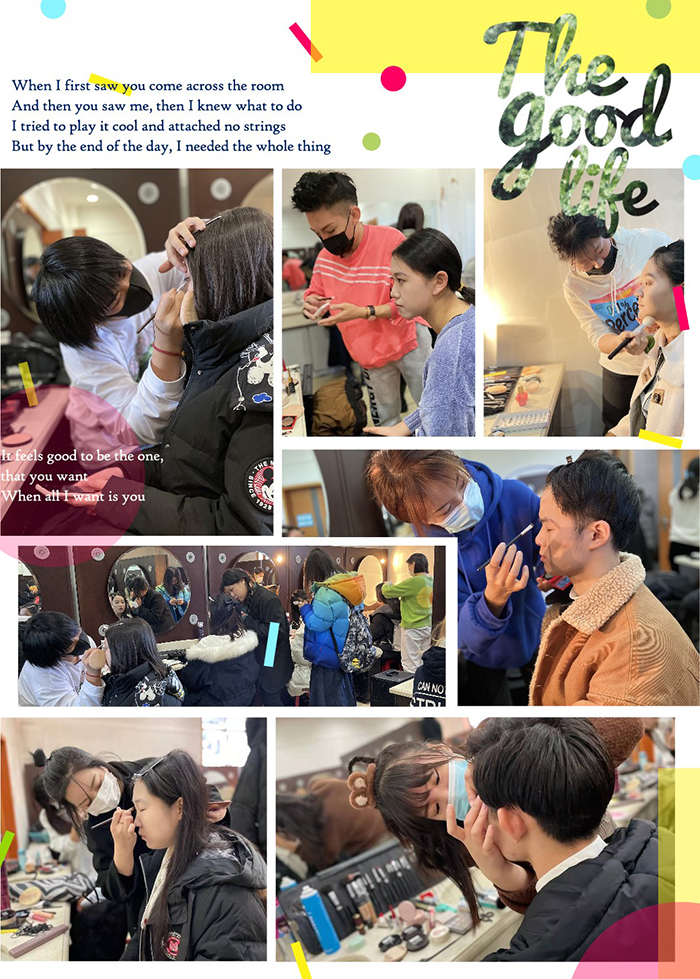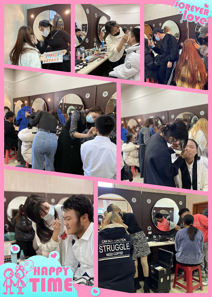 在李春杰老师的协调和指导下,国际化妆班的学员一大早便赶往东北大学南湖校区,她们克服了天气寒冷、化妆场地相对狭小简陋、上妆人数众多且妆面要求高的众多现实困难,打起精神施展所学,用精湛的技艺、热情的态度和年轻人特有的朝气,赢得了参演人员和活动组委会的一致好评,展示了统丽人在化妆、造型、发式设计、服装配饰等方面的精深功底,以及无私奉献精神和正能量,为此次文化节和晚会的顺利举行提供了不可或缺的技术支持,又一次为统丽社会实践实习路线做出完美的注解!