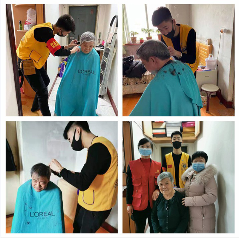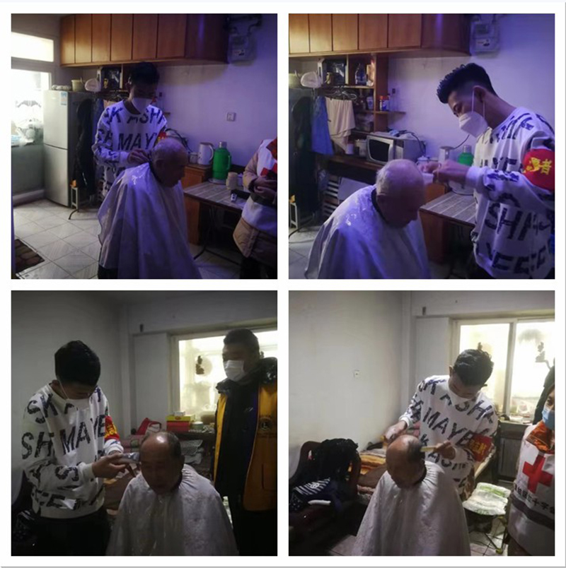 统丽团队兵分两路。得知有数名行动不便的老年人无法来到义剪现场,刘鑫淼和郭佳忱同学主动请缨,在社区工作人员的带领下,上门为困难群众提供理发服务,还简单地打扫了一下卫生。虽是举手之劳,但老人们属实感受到了来自统丽人、来自整个社会的关爱。“我腿脚不便利,听说今天有免费理发的活动,只能干着急。真没想到这些孩子上门来给我理发,统丽人真是活雷锋。太谢谢你们啦!”