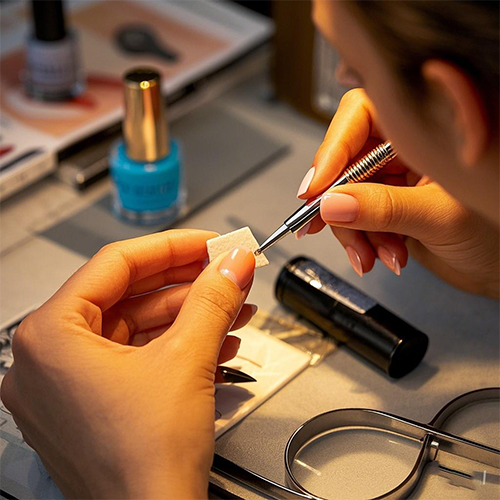 我们都知道亮片是最难卸掉的,所以沈阳美甲学校建议用棉球卸带有亮片的指甲油。先把棉球浸投卸甲水中,然后每个指甲上贴一个棉球,几分钟之后,轻柔地按压并抹去指甲油,你应该会发现亮片已经随之附着在棉球上了。