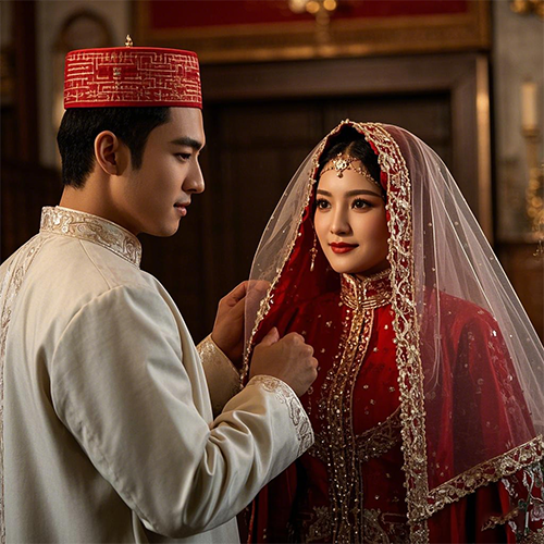 新娘头上戴维吾尔族传统花帽,用金银线绣花点缀与装饰,喀什的四楞花帽堪称维族花帽主流。