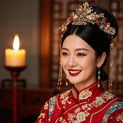 满族新娘大婚当日,挽髻成单,蒙上红盖头,身着大红绣花及脚踝旗袍,添绣花红色坎肩,或白色绸带假领。坎肩多为对襟式,对襟下端多为如意头式,衣缘多镶以艳丽花边。