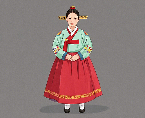 朝鲜族人举办婚礼这天,新娘头挽“大发”,上戴“簇头里”,发钗上悬垂两条宽“发带”,垂于前胸两侧,穿淡绿色圆衫,有彩色袖口,下穿红色长裙,腰上系红带,外披长衣,脚穿白袜和勾勾鞋。