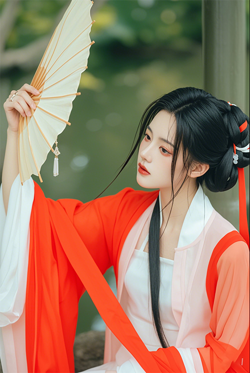 妆容、造型准备好了之后,拍摄时,还需要引导模特摆出具有古风的造型。怎么摆姿势,其实可以参考一下古代的电视剧、电影作品。手里的摇扇可以当做道具,放在额头前遮挡阳光。